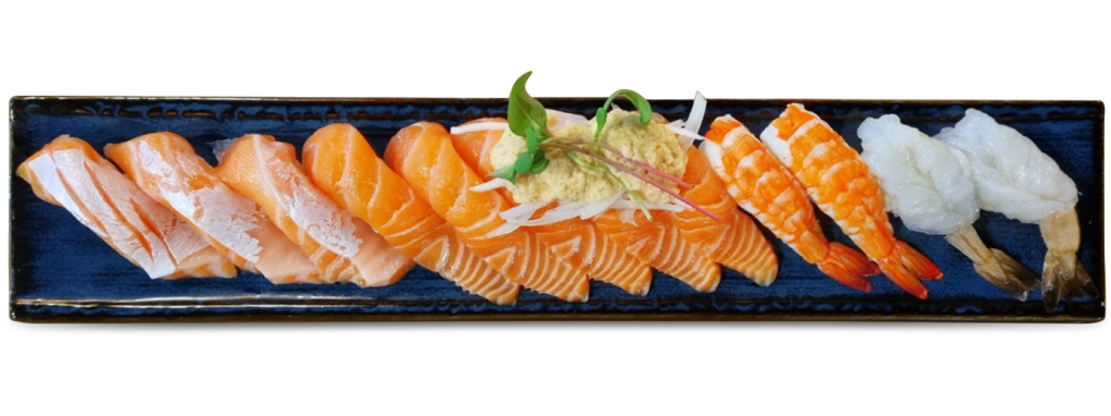 두툼한 프리미엄 연어, 탱글탱글 신선한 생새우, 신선한 초새우를 갓 지은 경기미 하얀 쌀밥위에 얹고 생와사비로 간을 맞춘 최고급 초밥입니다.